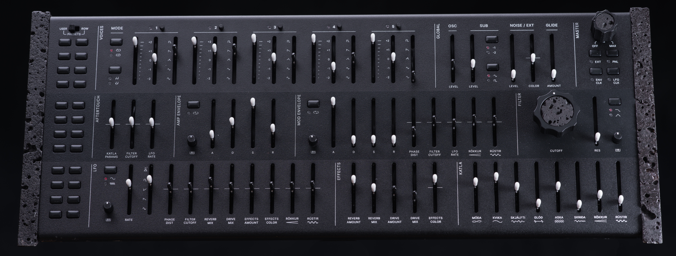 Since each Katla is meticulously hand assembled, it is fair to say that every unit is not just a synthesizer but rather a rare, finely-crafted piece of musical artistry. According to Genki Instruments CEO Ólafur Bjarki Bogason, “Beyond the volcanic synth concept, we wanted to create a truly inspiring instrument with loads of character and a unique and immense quality; I hope artists appreciate the attention to detail we put into it - quality that can be felt all the way from the bold aesthetics and design, the high torque of the sliders, to how Katla sounds and feels to play. Now that we are emerging out on the other side of the creative process, I feel grateful for the opportunity to create a truly novel synth that will hopefully inspire a whole new generation of players.”